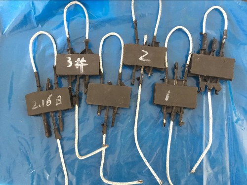 鋼絲繩輸送帶熱硫化接頭的強度主要是通過鋼絲繩對橡膠的粘著力實現的。這個粘著力我們往往習慣用抽出力表示,也就是埋入橡膠中的單位長度鋼絲繩抽出所需的力。我公司對接頭膠進行實驗,通過下圖實驗可以看出鋼絲繩上充滿了芯膠,說明我公司芯膠與鋼絲繩的粘接力和結合力非常強。